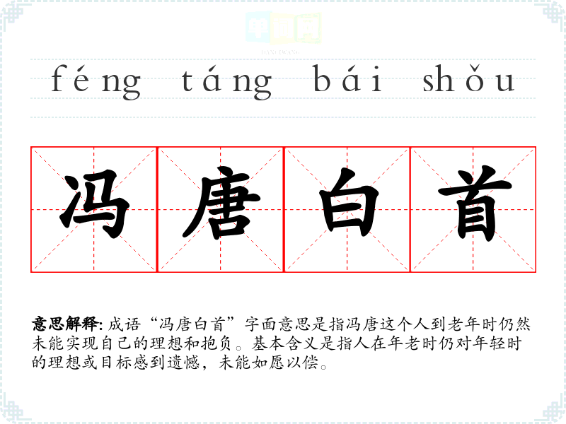 “冯唐白首”出自唐代诗人王维的《送别》中的一句“冯唐易老,李广难封。”冯唐和李广都是历史上著名的人物,冯唐以才华横溢而闻名,但终其一生未能实现理想;而李广虽勇猛善战,却因种种原因未能获得应有的封赏。这个成语由此引申出对未能实现理想的感慨。