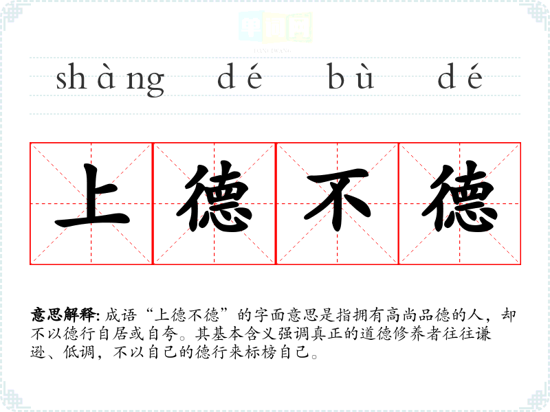 成语“上德不德”的字面意思是指拥有高尚品德的人,却不以德行自居或自夸。其基本含义强调真正的道德修养者往往谦逊、低调,不以自己的德行来标榜自己。