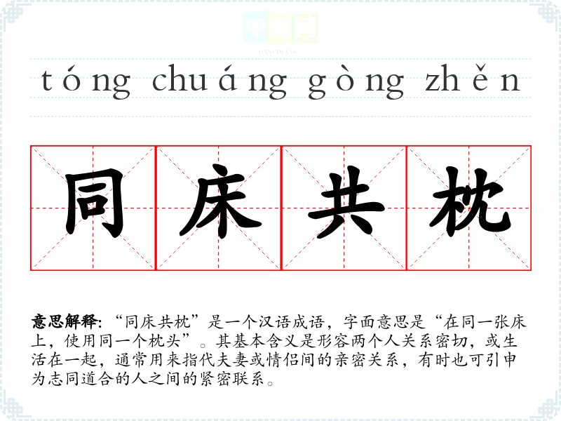 “同床共枕”是一个汉语成语,字面意思是“在同一张床上,使用同一个枕头”。其基本含义是形容两个人关系密切,或生活在一起,通常用来指代夫妻或情侣间的亲密关系,有时也可引申为志同道合的人之间的紧密联系。
