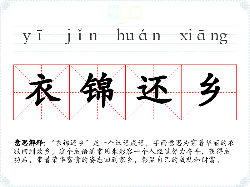 “衣锦还乡”是一个汉语成语,字面意思为穿着华丽的衣服回到故乡。这个成语通常用来形容一个人经过努力奋斗,获得成功后,带着荣华富贵的姿态回到家乡,彰显自己的成就和财富。
