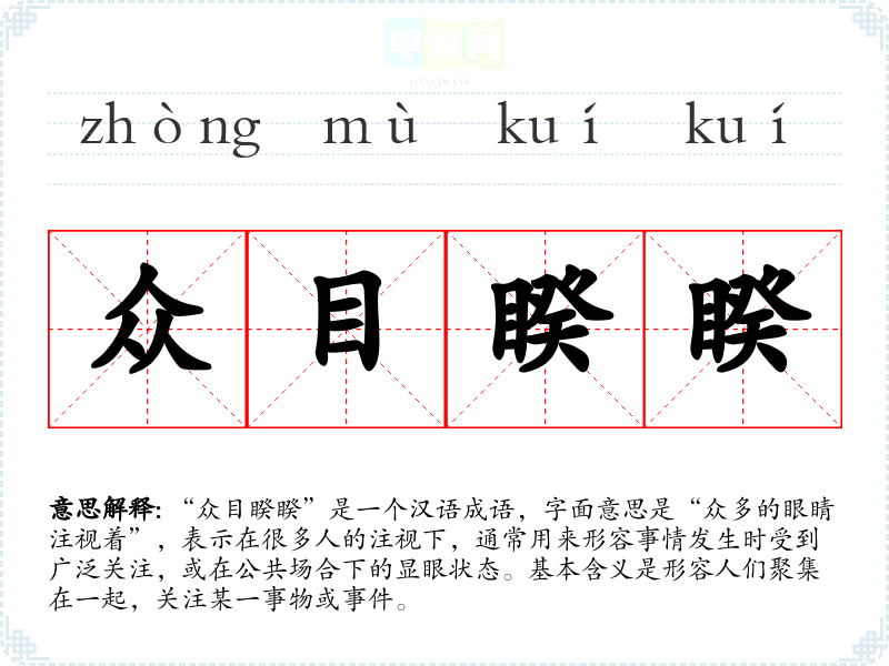 “众目睽睽”是一个汉语成语,字面意思是“众多的眼睛注视着”,表示在很多人的注视下,通常用来形容事情发生时受到广泛关注,或在公共场合下的显眼状态。基本含义是形容人们聚集在一起,关注某一事物或**。