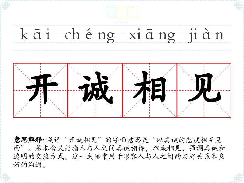 成语“开诚相见”的字面意思是“以真诚的态度相互见面”。基本含义是指人与人之间真诚相待,坦诚相见,强调真诚和透明的交流方式。这一成语常用于形容人与人之间的友好关系和良好的沟通。