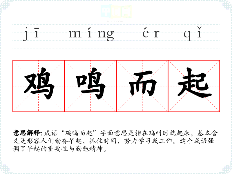 成语“鸡鸣而起”字面意思是指在鸡叫时就起床,基本含义是形容人们勤奋早起,抓住时间,努力学*或工作。这个成语强调了早起的重要性与勤勉精神。