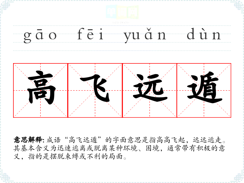 成语“高飞远遁”的字面意思是指高高飞起,远远逃走。其基本含义为迅速逃离或脱离某种环境、困境,通常带有积极的意义,指的是摆脱束缚或不利的局面。