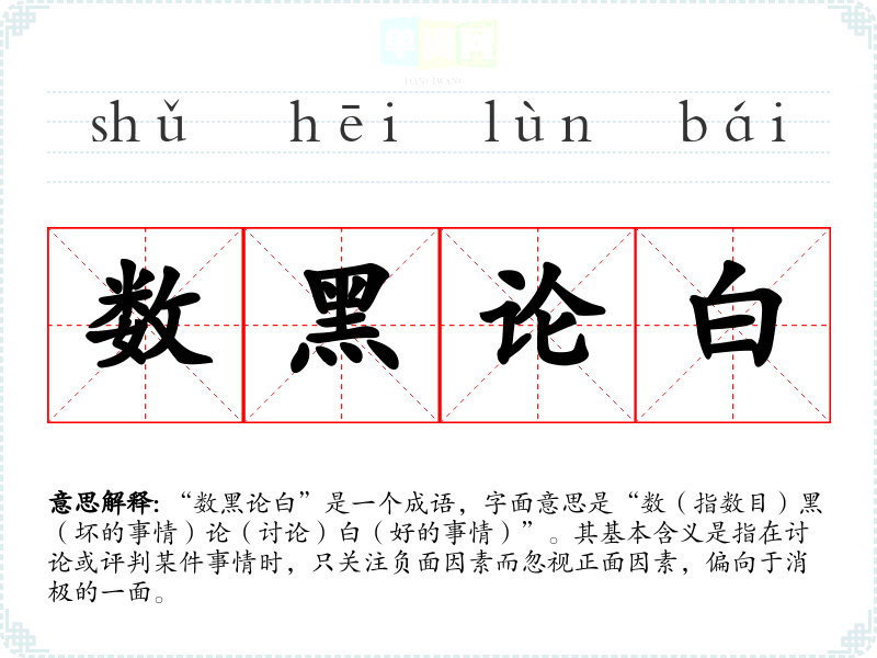 “数黑论白”是一个成语,字面意思是“数(指数目)黑(坏的事情)论(讨论)白(好的事情)”。其基本含义是指在讨论或评判某件事情时,只关注负面因素而忽视正面因素,偏向于消极的一面。