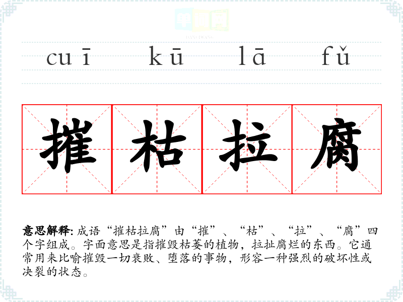 成语“摧枯拉腐”由“摧”、“枯”、“拉”、“腐”四个字组成。字面意思是指摧毁枯萎的植物,拉扯腐烂的东西。它通常用来比喻摧毁一切衰败、堕落的事物,形容一种强烈的破坏性或决裂的状态。