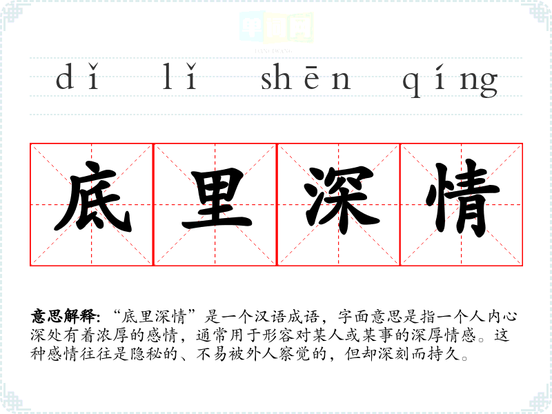 “底里深情”是一个汉语成语,字面意思是指一个人内心深处有着浓厚的感情,通常用于形容对某人或某事的深厚情感。这种感情往往是隐秘的、不易被外人察觉的,但却深刻而持久。