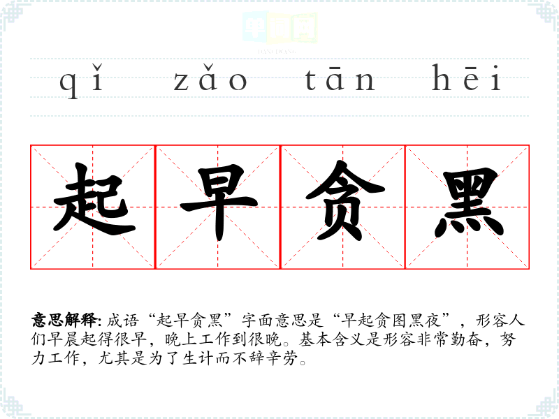 成语“起早贪黑”字面意思是“早起贪图黑夜”,形容人们早晨起得很早,晚上工作到很晚。基本含义是形容非常勤奋,努力工作,尤其是为了生计而不辞辛劳。