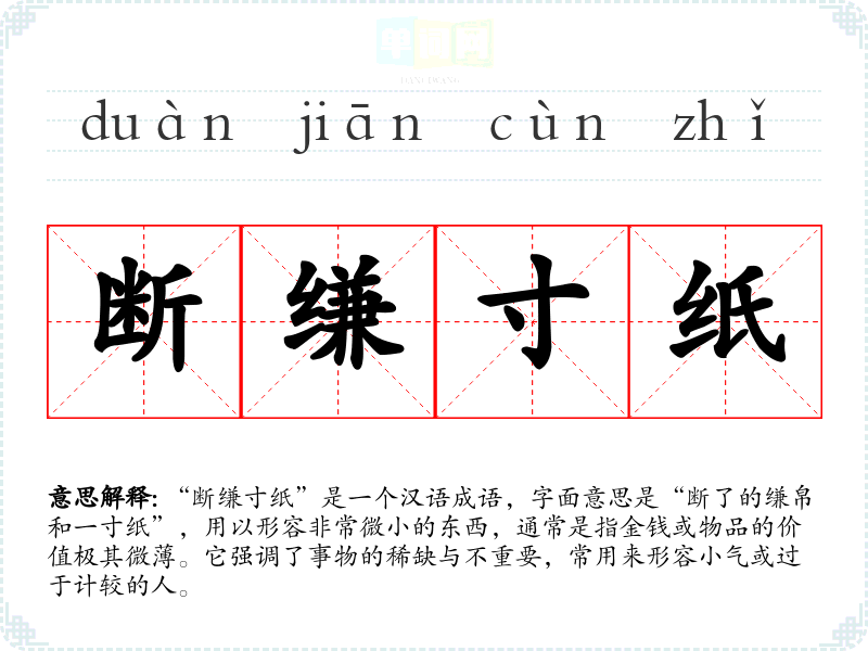 “断缣寸纸”是一个汉语成语,字面意思是“断了的缣帛和一寸纸”,用以形容非常微小的东西,通常是指金钱或物品的价值极其微*。它强调了事物的稀缺与不重要,常用来形容小气或过于计较的人。
