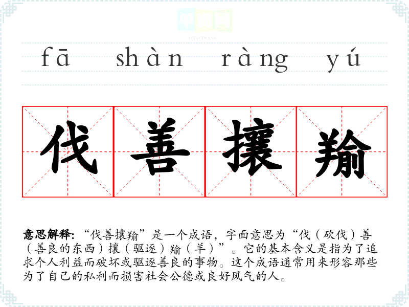 “伐善攘羭”是一个成语,字面意思为“伐(砍伐)善(善良的东西)攘(驱逐)羭(羊)”。它的基本含义是指为了追求个人利益而破坏或驱逐善良的事物。这个成语通常用来形容那些为了自己的私利而损害社会公德或良好风气的人。