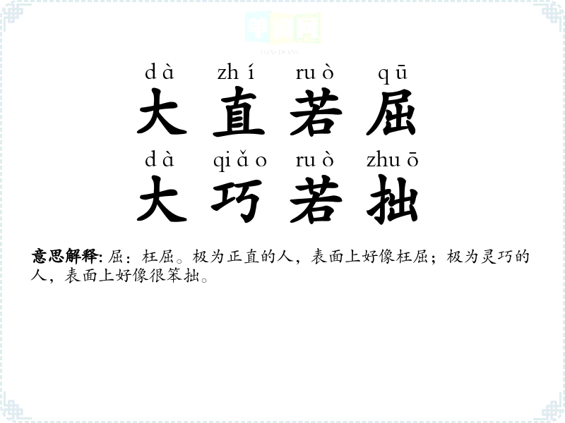 | 大直若屈,大巧若拙 | 屈:枉屈。极为正直的人,表面上好像枉屈;极为灵巧的人,表面上好像很笨拙。 |