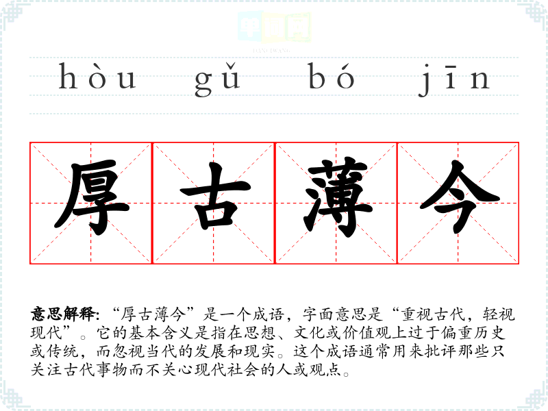 | 厚古薄今 | 厚:推崇,重视;薄:轻视,怠慢。推崇古代的,轻视现代的。多用于学术研究方面。 |