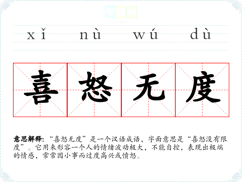 “喜怒无度”是一个汉语成语,字面意思是“喜怒没有限度”。它用来形容一个人的情绪波动极大,不能自控,表现出极端的情感,常常因小事而过度高兴或愤怒。
