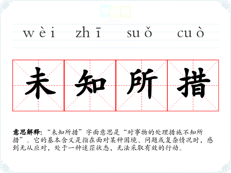 “未知所措”字面意思是“对事物的处理措施不知所措”。它的基本含义是指在面对某种困境、问题或复杂情况时,感到无从应对,处于一种迷茫状态,无法采取有效的行动。