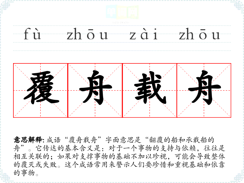 成语“覆舟载舟”字面意思是“翻覆的船和承载船的舟”。它传达的基本含义是:对于一个事物的支持与依赖,往往是相互关联的;如果对支撑事物的基础不加以珍视,可能会导致整体的覆灭或失败。这个成语常用来警示人们要珍惜和重视基础和依靠的事物。