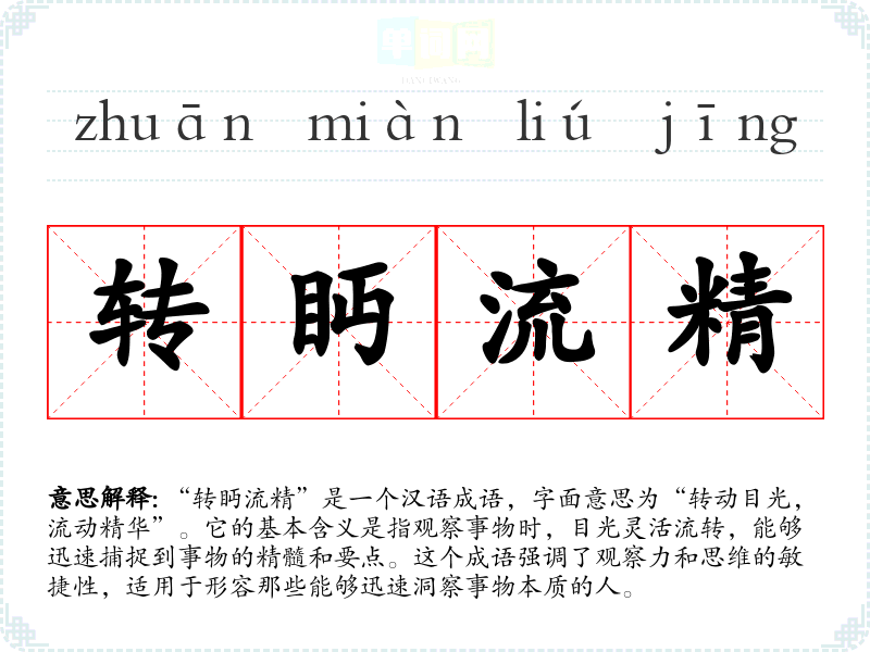 “转眄流精”是一个汉语成语,字面意思为“转动目光,流动精华”。它的基本含义是指观察事物时,目光灵活流转,能够迅速捕捉到事物的精髓和要点。这个成语强调了观察力和思维的敏捷性,适用于形容那些能够迅速洞察事物本质的人。