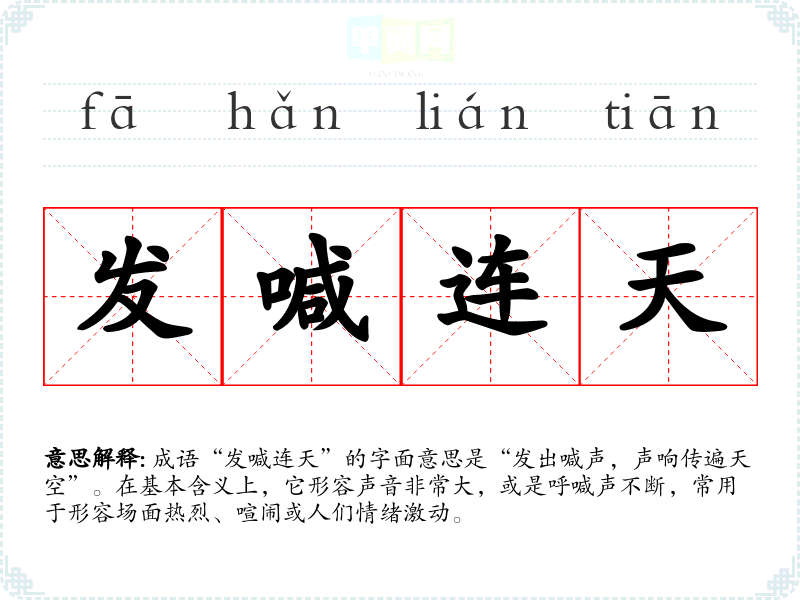 成语“发喊连天”的字面意思是“发出喊声,声响传遍天空”。在基本含义上,它形容声音非常大,或是呼喊声不断,常用于形容场面热烈、喧闹或人们情绪激动。