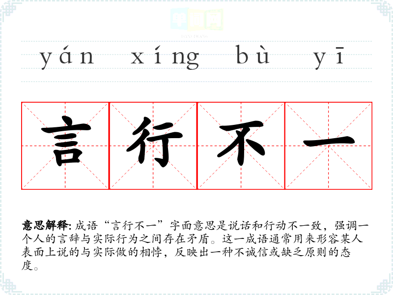成语“言行不一”字面意思是说话和行动不一致,强调一个人的言辞与实际行为之间存在矛盾。这一成语通常用来形容某人表面上说的与实际做的相悖,反映出一种不诚信或缺乏原则的态度。