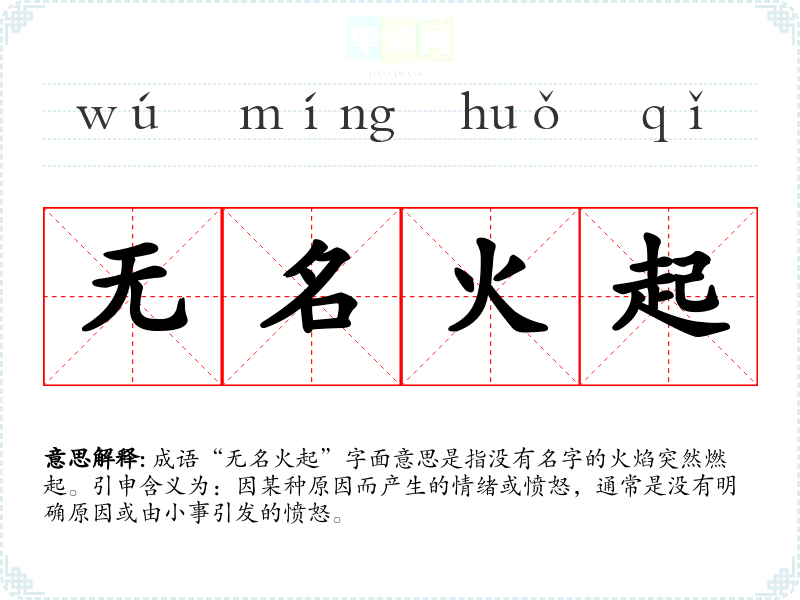 成语“无名火起”字面意思是指没有名字的火焰突然燃起。引申含义为:因某种原因而产生的情绪或愤怒,通常是没有明确原因或由小事引发的愤怒。