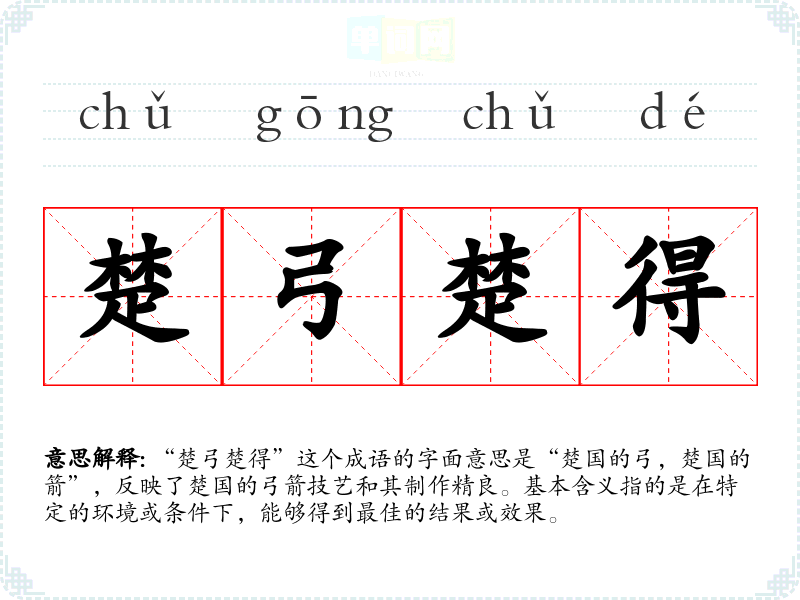 “楚弓楚得”这个成语的字面意思是“楚国的弓,楚国的箭”,反映了楚国的弓箭技艺和其制作精良。基本含义指的是在特定的环境或条件下,能够得到最佳的结果或效果。