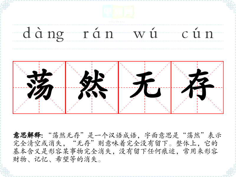 “荡然无存”是一个汉语成语,字面意思是“荡然”表示完全清空或消失,“无存”则意味着完全没有留下。整体上,它的基本含义是形容某事物完全消失,没有留下任何痕迹,常用来形容财物、记忆、希望等的消失。