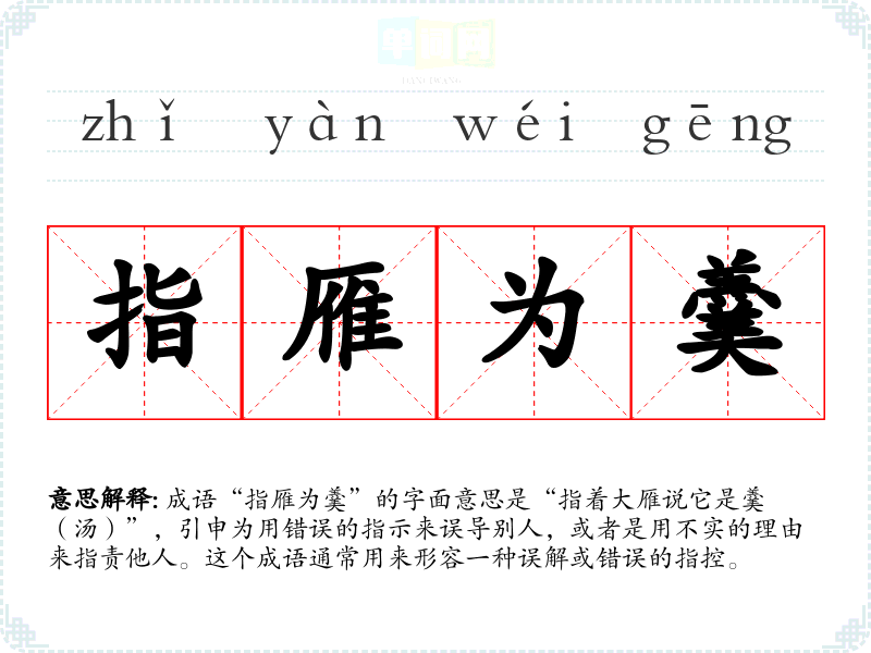 成语“指雁为羹”的字面意思是“指着大雁说它是羹(汤)”,引申为用错误的指示来误导别人,或者是用不实的理由来指责他人。这个成语通常用来形容一种误解或错误的指控。