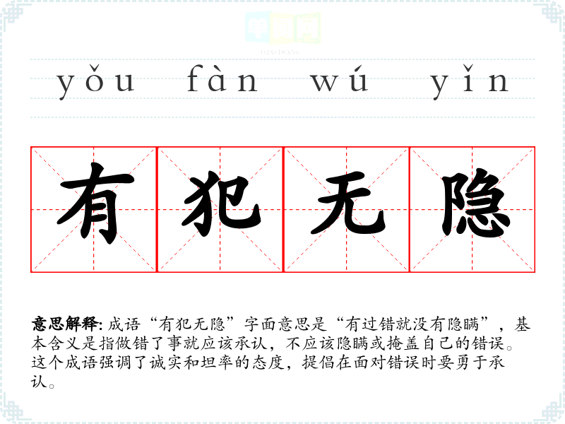 成语“有犯无隐”字面意思是“有过错就没有隐瞒”,基本含义是指做错了事就应该承认,不应该隐瞒或掩盖自己的错误。这个成语强调了诚实和坦率的态度,提倡在面对错误时要勇于承认。
