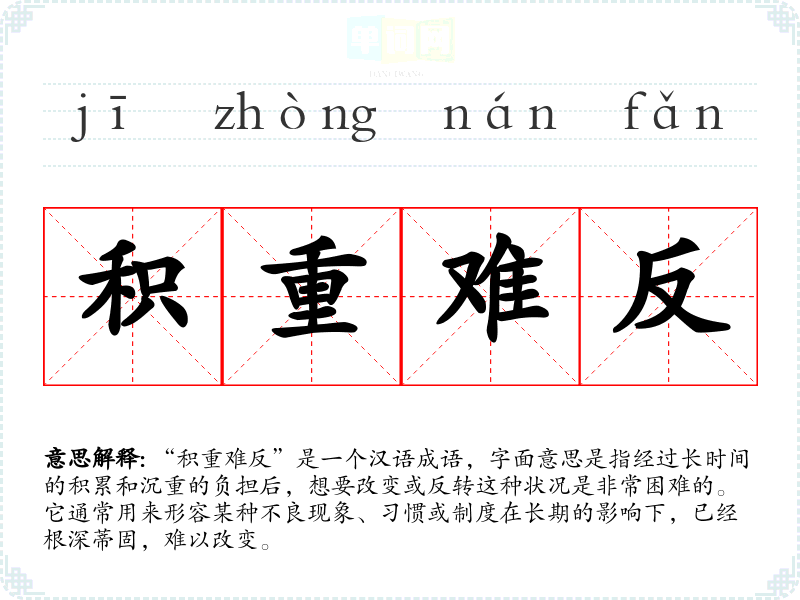 “积重难反”是一个汉语成语,字面意思是指经过长时间的积累和沉重的负担后,想要改变或反转这种状况是非常困难的。它通常用来形容某种不良现象、*惯或制度在长期的影响下,已经根深蒂固,难以改变。