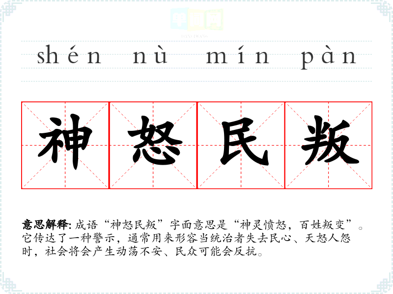 该成语并没有明确的文学出处,但其意象可以追溯到古代的政治思想和民众情绪。在历史上,许多朝代的覆灭往往与统治者的暴政和民众的反抗有关,因此“神怒”和“民叛”可以被视为古代统治者与民众之间关系的象征。