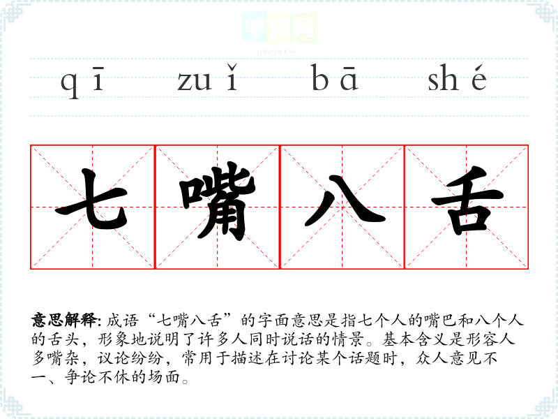 “七嘴八舌”最早出现在古代文献中,虽然没有确切的典故,但其构成的“七”和“八”在**传统文化中常被用来表示数量多、纷繁。这个成语体现了古代社会对人际交流和言语表达的观察,反映了人们在讨论中可能出现的多样化意见。