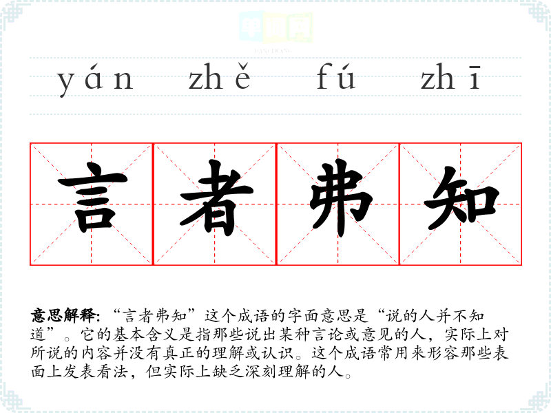 “言者弗知”这个成语的字面意思是“说的人并不知道”。它的基本含义是指那些说出某种言论或意见的人,实际上对所说的内容并没有真正的理解或认识。这个成语常用来形容那些表面上发表看法,但实际上缺乏深刻理解的人。