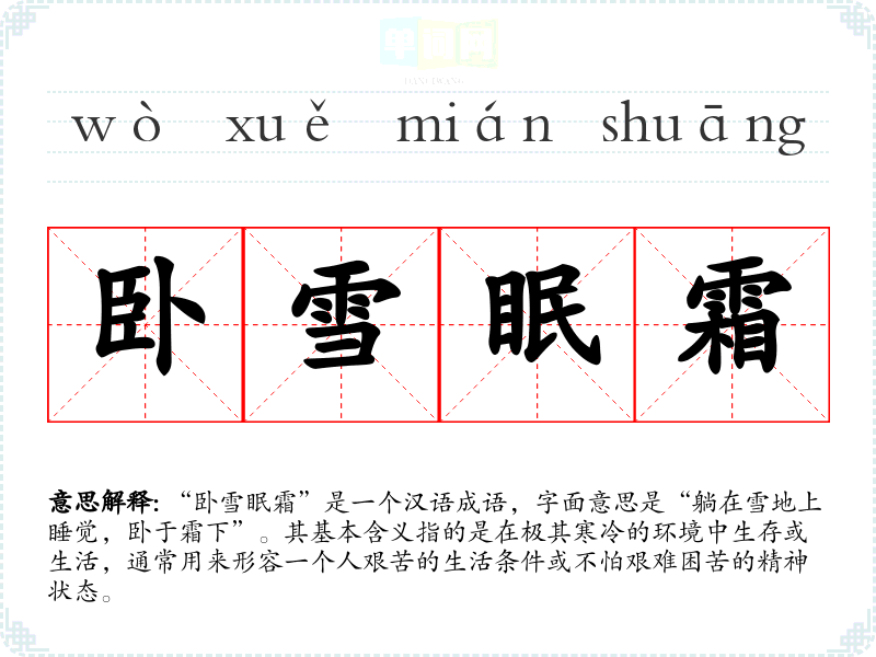 “卧雪眠霜”是一个汉语成语,字面意思是“躺在雪地上睡觉,卧于霜下”。其基本含义指的是在极其寒冷的环境中生存或生活,通常用来形容一个人艰苦的生活条件或不怕艰难困苦的精神状态。