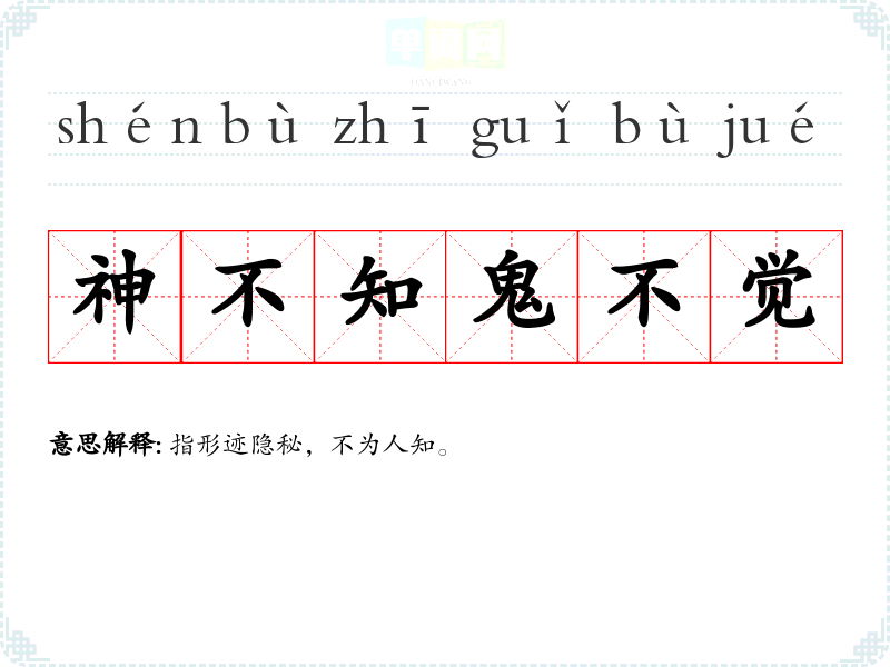 | 神不知鬼不觉 | 指形迹隐秘,不为人知。 |