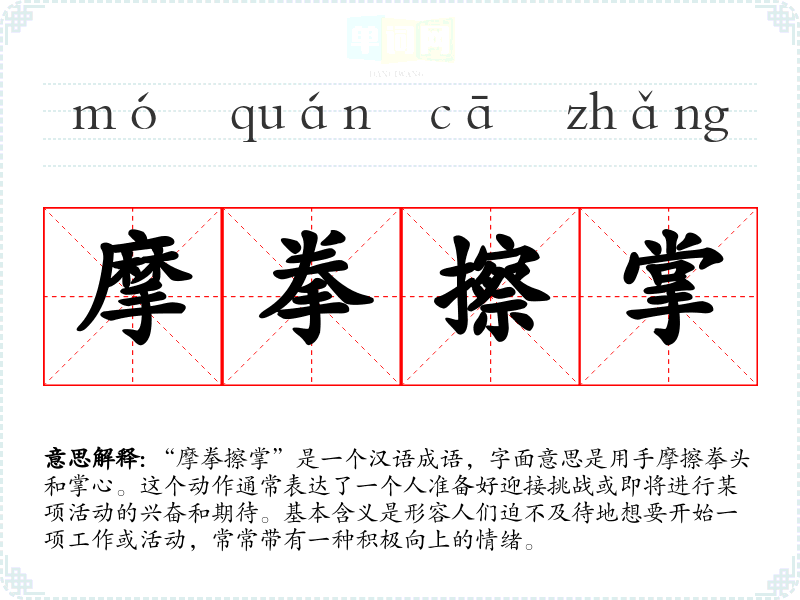 “摩拳擦掌”是一个汉语成语,字面意思是用手摩擦拳头和掌心。这个动作通常表达了一个人准备好迎接挑战或即将进行某项活动的兴奋和期待。基本含义是形容人们迫不及待地想要开始一项工作或活动,常常带有一种积极向上的情绪。