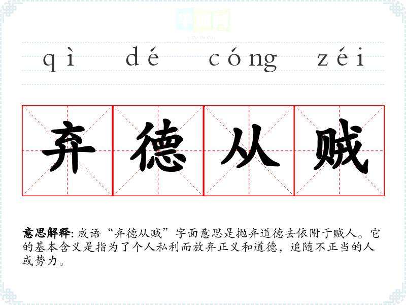 成语“弃德从贼”字面意思是抛弃道德去依附于贼人。它的基本含义是指为了****而放弃正义和道德,追随不正当的人或势力。
