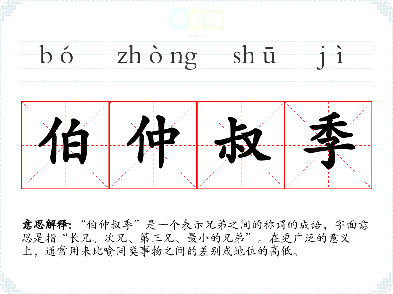 | 伯仲叔季 | 兄弟排行的次序,伯是老大,仲是第二,叔是第三,季是最小的。 |