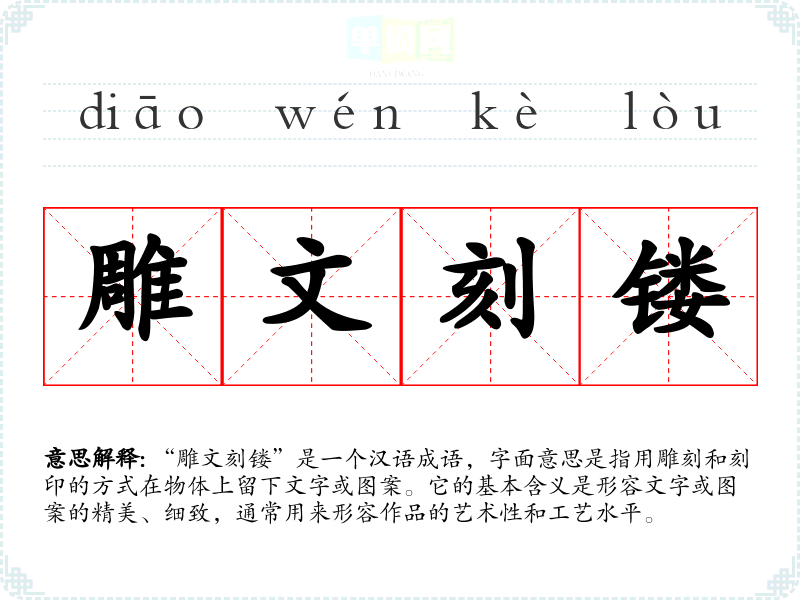 “雕文刻镂”是一个汉语成语,字面意思是指用雕刻和刻印的方式在物体上留下文字或图案。它的基本含义是形容文字或图案的精美、细致,通常用来形容作品的艺术性和工艺水平。