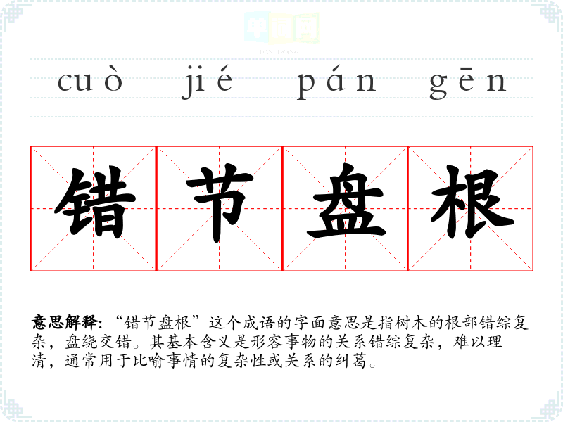 “错节盘根”这个成语的字面意思是指树木的根部错综复杂,盘绕交错。其基本含义是形容事物的关系错综复杂,难以理清,通常用于比喻事情的复杂性或关系的纠葛。