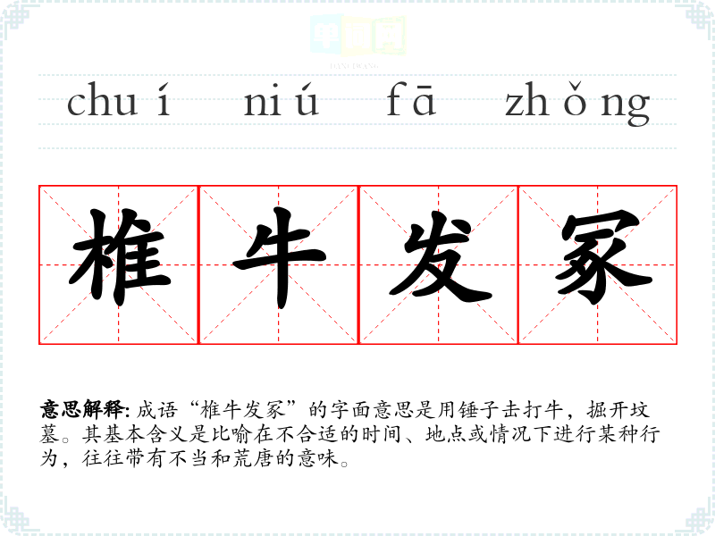 成语“椎牛发冢”的字面意思是用锤子击打牛,掘开坟墓。其基本含义是比喻在不合适的时间、地点或情况下进行某种行为,往往带有不当和荒唐的意味。