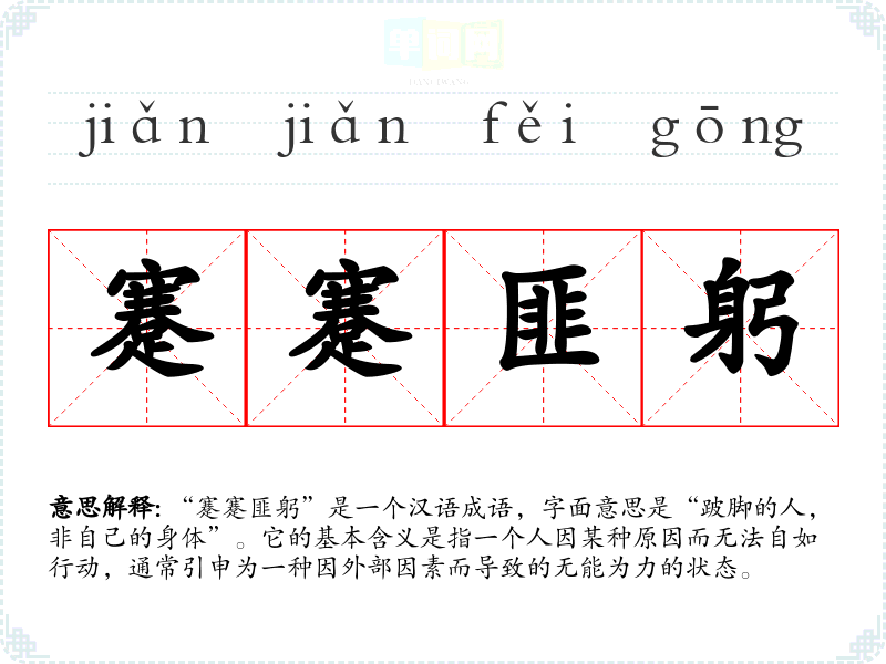 “蹇蹇匪躬”是一个汉语成语,字面意思是“跛脚的人,非自己的身体”。它的基本含义是指一个人因某种原因而无法自如行动,通常引申为一种因外部因素而导致的无能为力的状态。