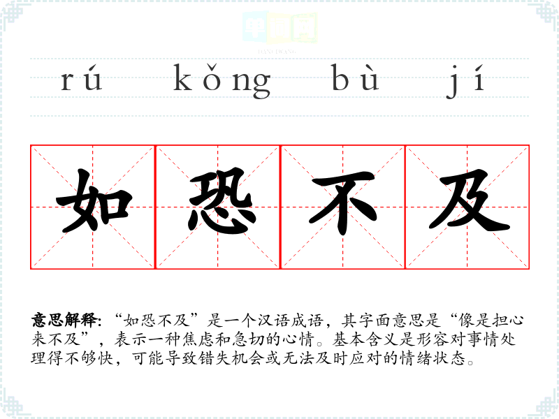 “如恐不及”是一个汉语成语,其字面意思是“像是担心来不及”,表示一种焦虑和急切的心情。基本含义是形容对事情处理得不够快,可能导致错失机会或无法及时应对的情绪状态。