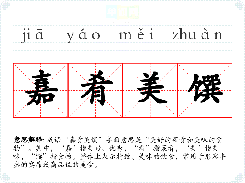 成语“嘉肴美馔”字面意思是“美好的菜肴和美味的食物”。其中,“嘉”指美好、优秀,“肴”指菜肴,“美”指美味,“馔”指食物。整体上表示精致、美味的饮食,常用于形容丰盛的宴席或高品位的美食。