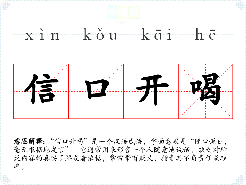 “信口开喝”是一个汉语成语,字面意思是“随口说出,毫无根据地发言”。它通常用来形容一个人随意地说话,缺乏对所说内容的真实了解或者依据,常常带有贬义,指责其不负责任或轻率。