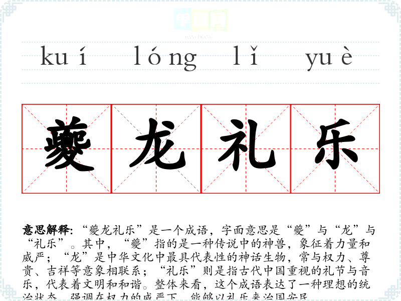 “夔龙礼乐”出自《尚书·大禹谟》,在古代文献中常常用来形容理想的统治者或治国理念。夔、龙的象征意义深入中华文化,强调领导者的德行和国家的和谐。这个成语体现了古代对君主的期望,希望他们能像夔和龙一样,展现出强大的威严,并通过礼乐来维护国家的稳定与繁荣。