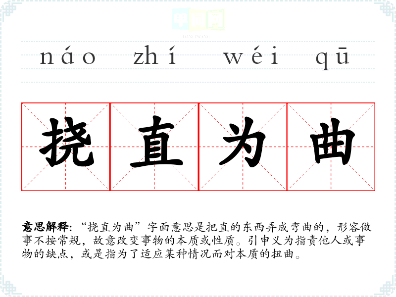 “挠直为曲”字面意思是把直的东西弄成弯曲的,形容做事不按常规,故意改变事物的本质或性质。引申义为指责他人或事物的缺点,或是指为了适应某种情况而对本质的扭曲。