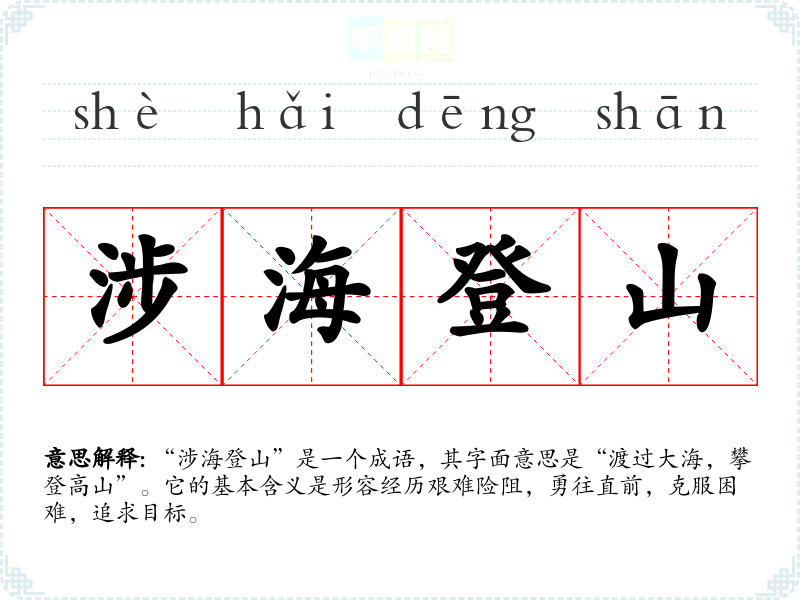 “涉海登山”是一个成语,其字面意思是“渡过大海,攀登高山”。它的基本含义是形容经历艰难险阻,勇往直前,克服困难,追求目标。