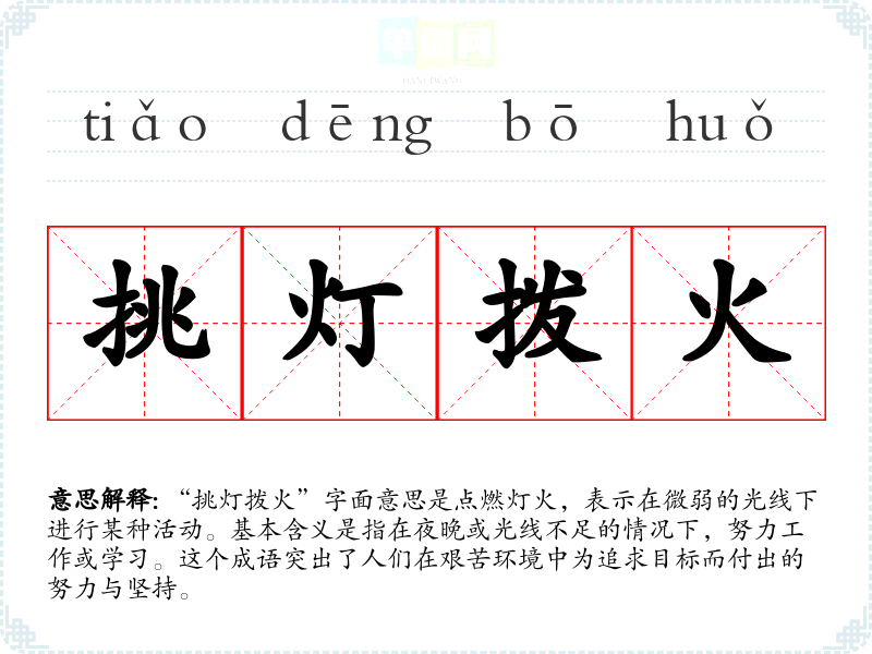 “挑灯拨火”字面意思是点燃灯火,表示在微弱的光线下进行某种活动。基本含义是指在夜晚或光线不足的情况下,努力工作或学*。这个成语突出了人们在艰苦环境中为追求目标而付出的努力与坚持。