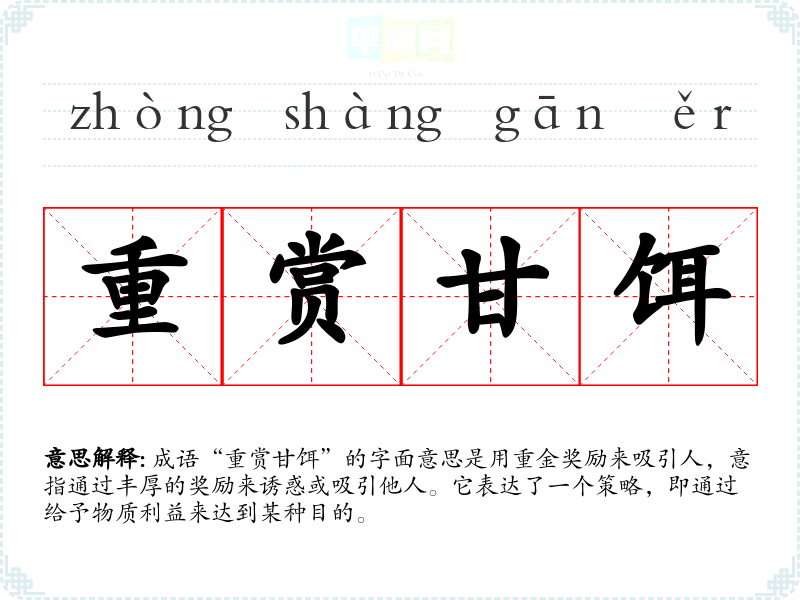 | 重赏甘饵 | 用厚重的奖赏作为诱饵,来吸引他人。 |
