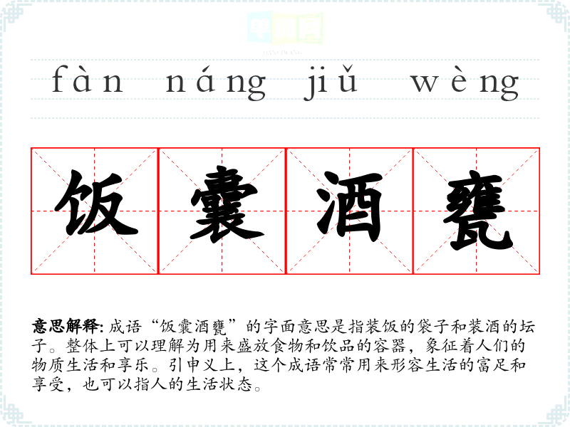 成语“饭囊酒甕”的字面意思是指装饭的袋子和装酒的坛子。整体上可以理解为用来盛放食物和饮品的容器,象征着人们的物质生活和享乐。引申义上,这个成语常常用来形容生活的富足和享受,也可以指人的生活状态。