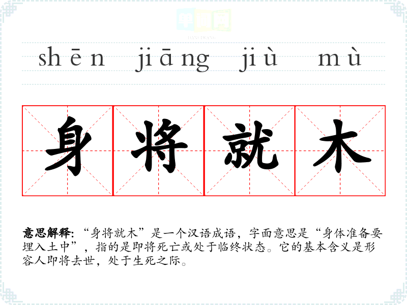 “身将就木”是一个汉语成语,字面意思是“身体准备要埋入土中”,指的是即将死亡或处于临终状态。它的基本含义是形容人即将去世,处于生死之际。